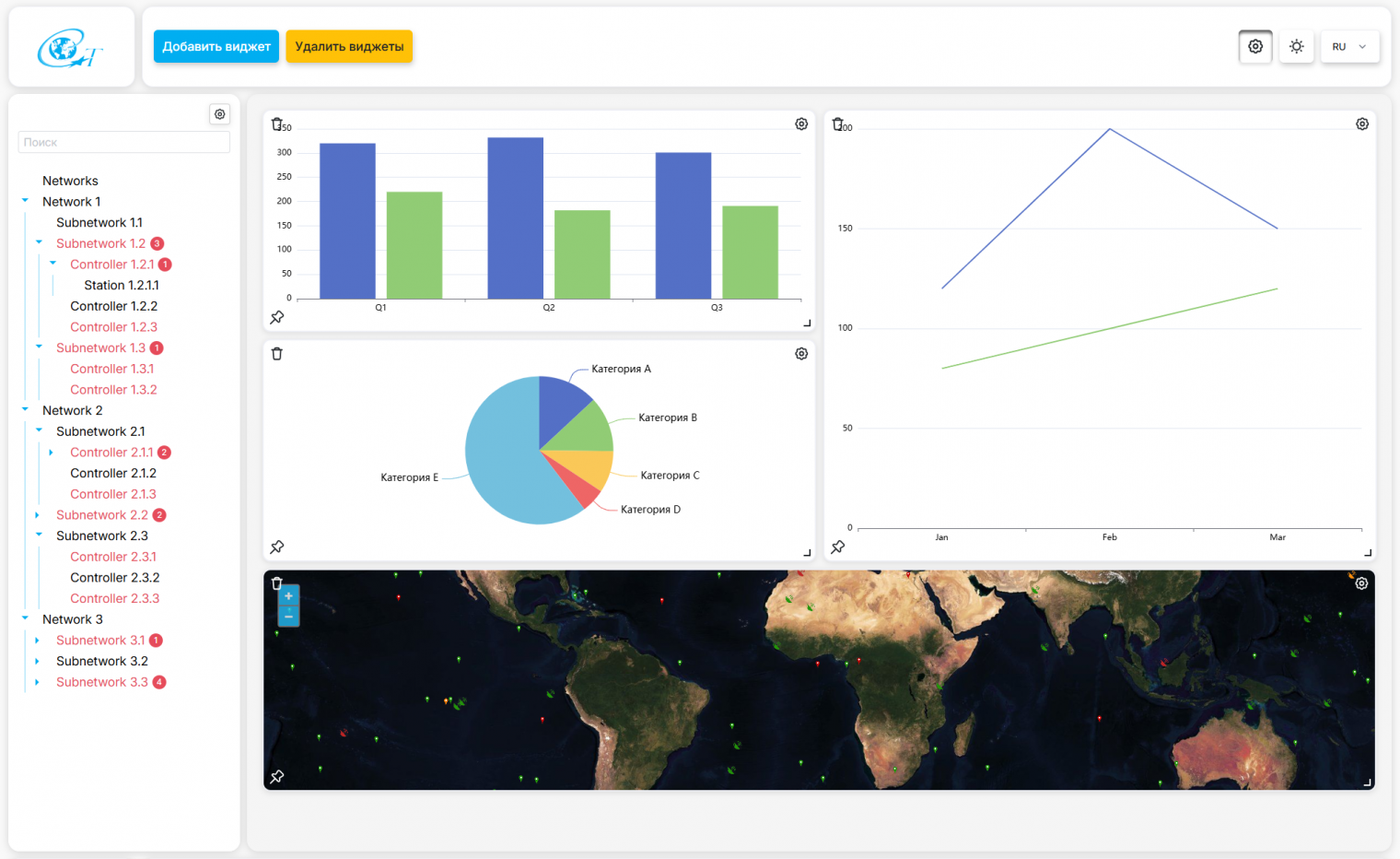 - Централизованный мониторинг, предоставляющий полную информацию о состоянии сети, событиях, уровнях сигнала, трафике и активности терминалов.